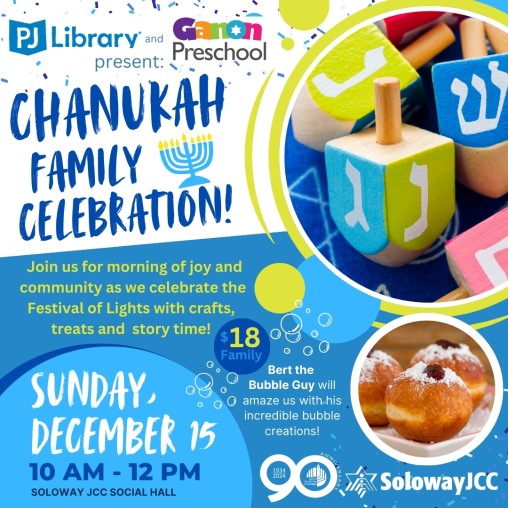 Join us for a joyful morning to celebrate the Festival of Lights. Be dazzled by Bert the Bubble Guy and his incredible bubble creations! Get creative with festive crafts, including dreidel decorating. Savour delicious sufganiyot and enjoy a special PJ story about the miracle of Chanukah. Let's celebrate! Sponsors: Soloway JCC, Ganon