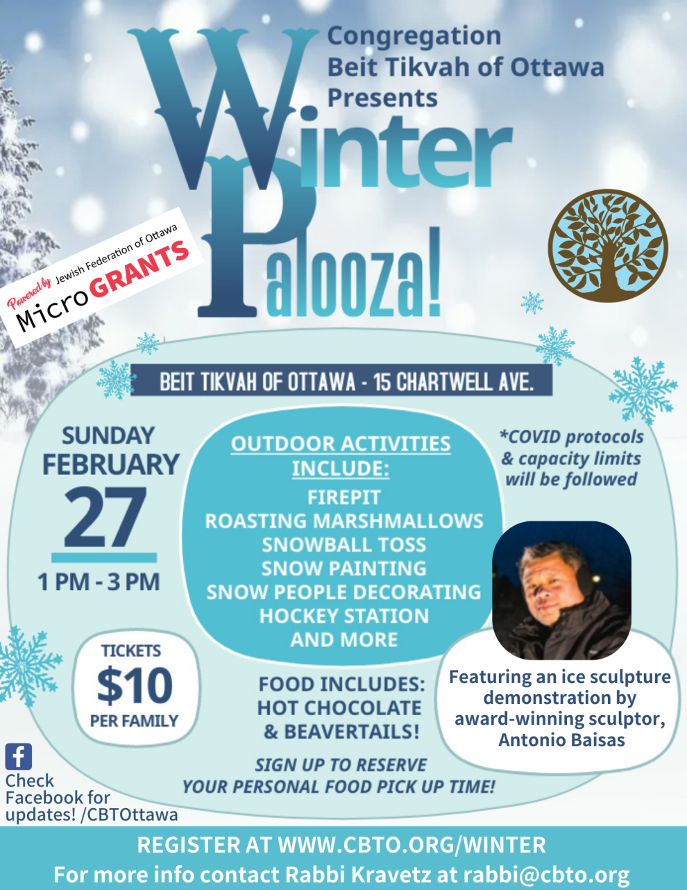 Congregation Beit Tikvah of Ottawa is planning an outdoor winter carnival. The event will include a variety of outdoor activities at Charing Park and the shul, including an ice sculpture carving demonstration by award-winning sculptor, Antonio Baisas, snowball toss, snow painting and hockey station and much more. “Carnival-themed food” at CBTO available for purchase.