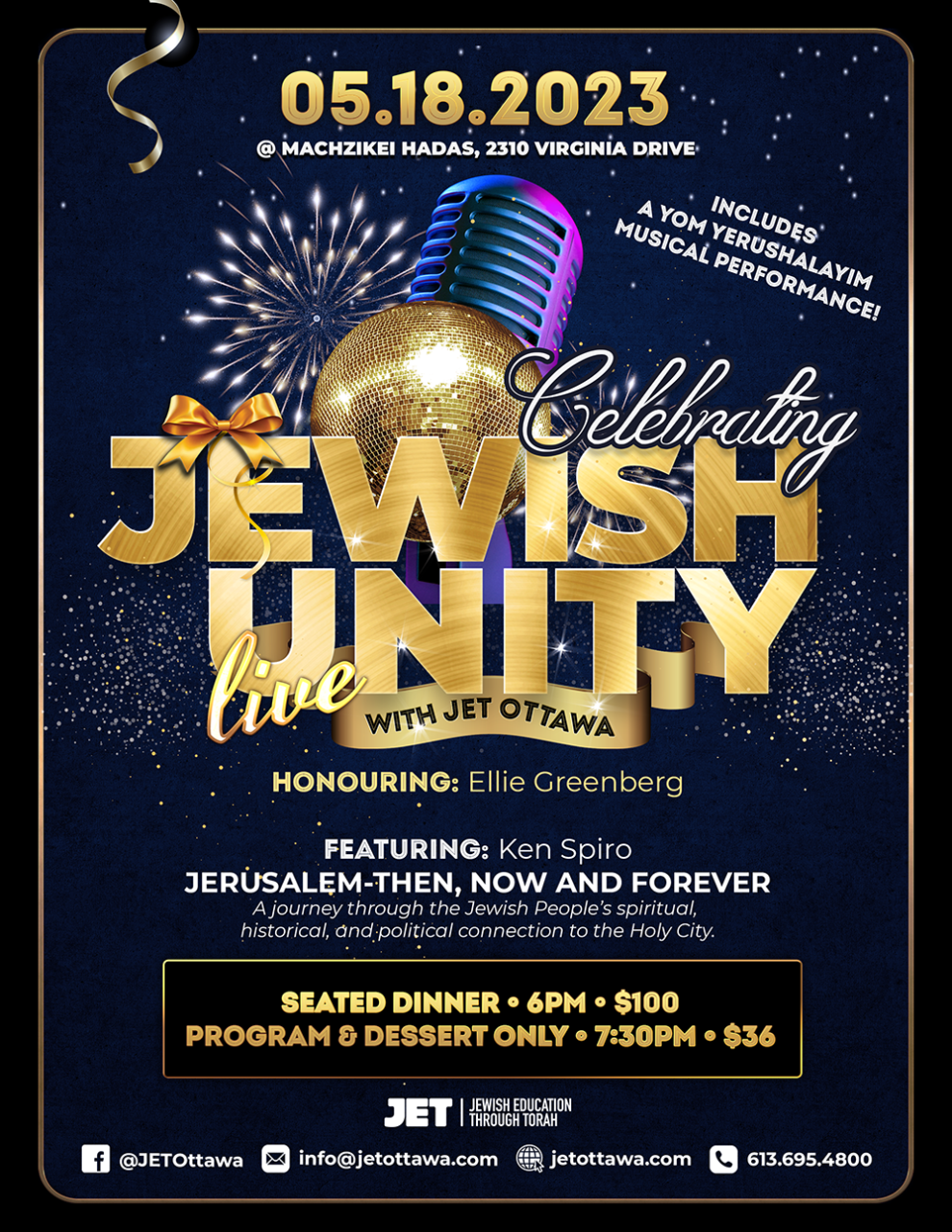 Celebrate Yom Yerushalayim with Ottawa's Jewish community at JET's annual Jewish Unity Live event. Honouring the passionate and dedicated Mrs. Ellie Greenberg and featuring a special guest speaker, from Israel, Rabbi Ken Spiro on Jerusalem - Then, Now and Forever, this is sure to be a dynamic night you don't want to miss. Catered by CKC, there is a sit-down dinner option as well as a dessert and shmooze following the event. You can even get a personalized message to the honouree, speaker or JET in our Tribute Journal.