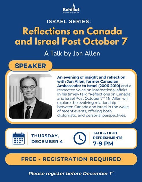An evening of insight and reflection with Jon Allen, former Canadian Ambassador to Israel (2006-2010) and a respected voice on international affairs. In his timely talk, "Reflections on Canada and Israel Post October 7," Mr. Allen will explore the evolving relationship between Canada and Israel in the wake of recent events, offering both diplomatic and personal perspectives.