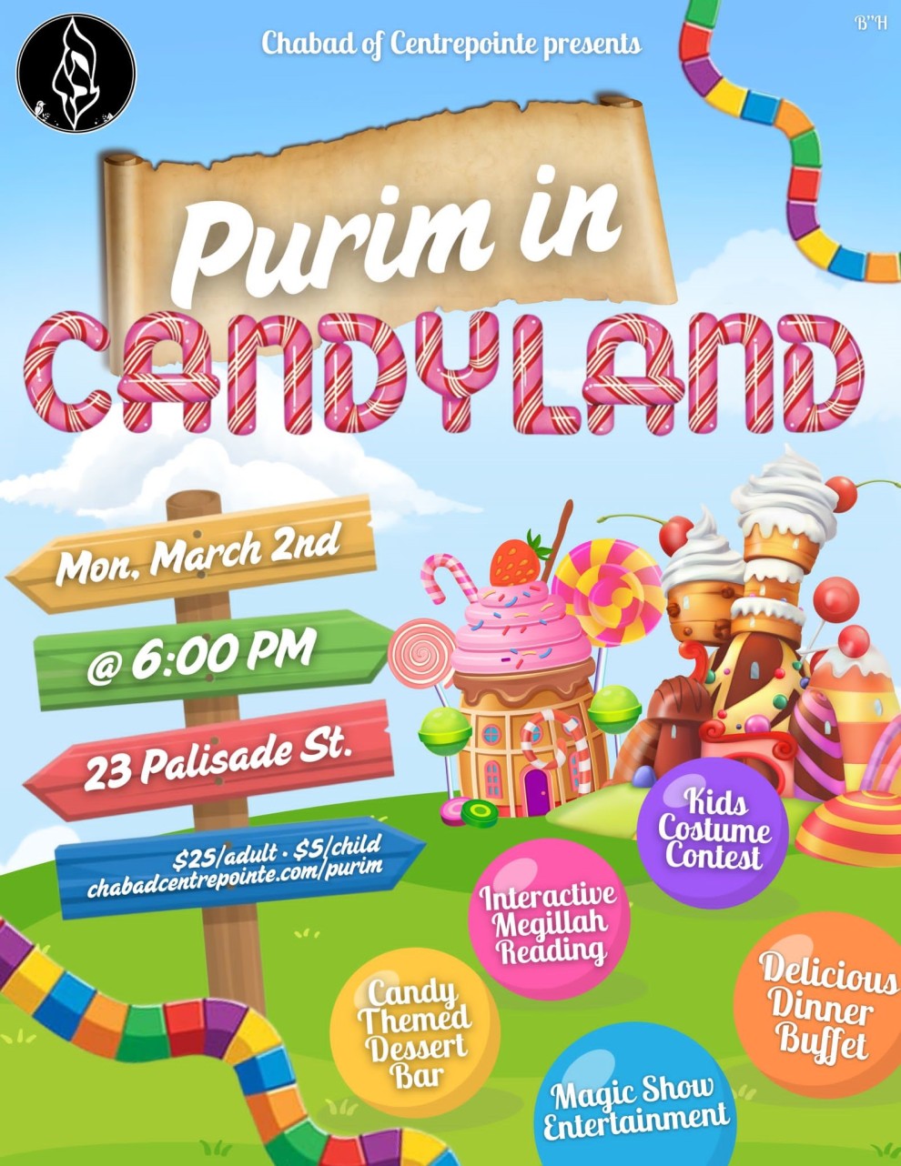 Our entire Purim party will transform into the giant, grand game of Candyland, with magical scenes around every corner. Enjoy a Megillah reading, a costume contest, lively games, crafts, and shows, and even a special game just for the adults.