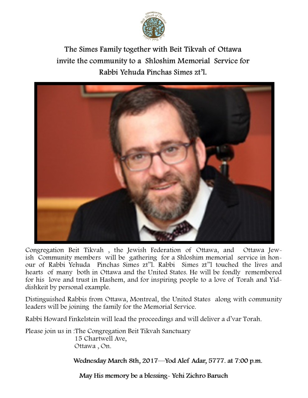 The Simes family together with Beit Tikvah of Ottawa invite the community to a Shloshim Memorial Service for Rabbi Yehuda Pinchas Simes zt"l.