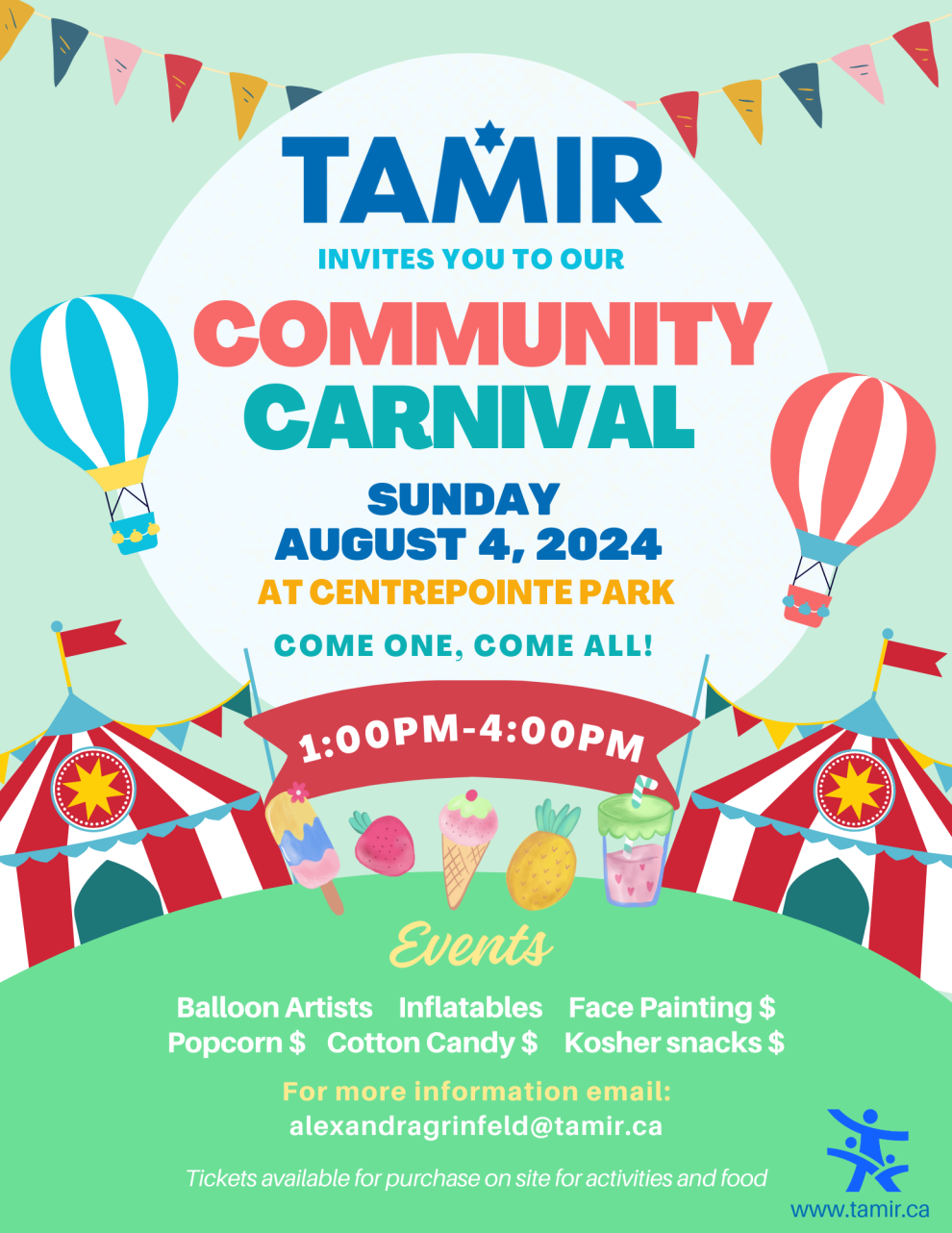 This is Tamir's annual community carnival fundraiser. Entrance is free to all with tickets available for purchase for certain activities and food. There will be balloon artists, inflatables, face painting, kosher snacks and other activities and games.